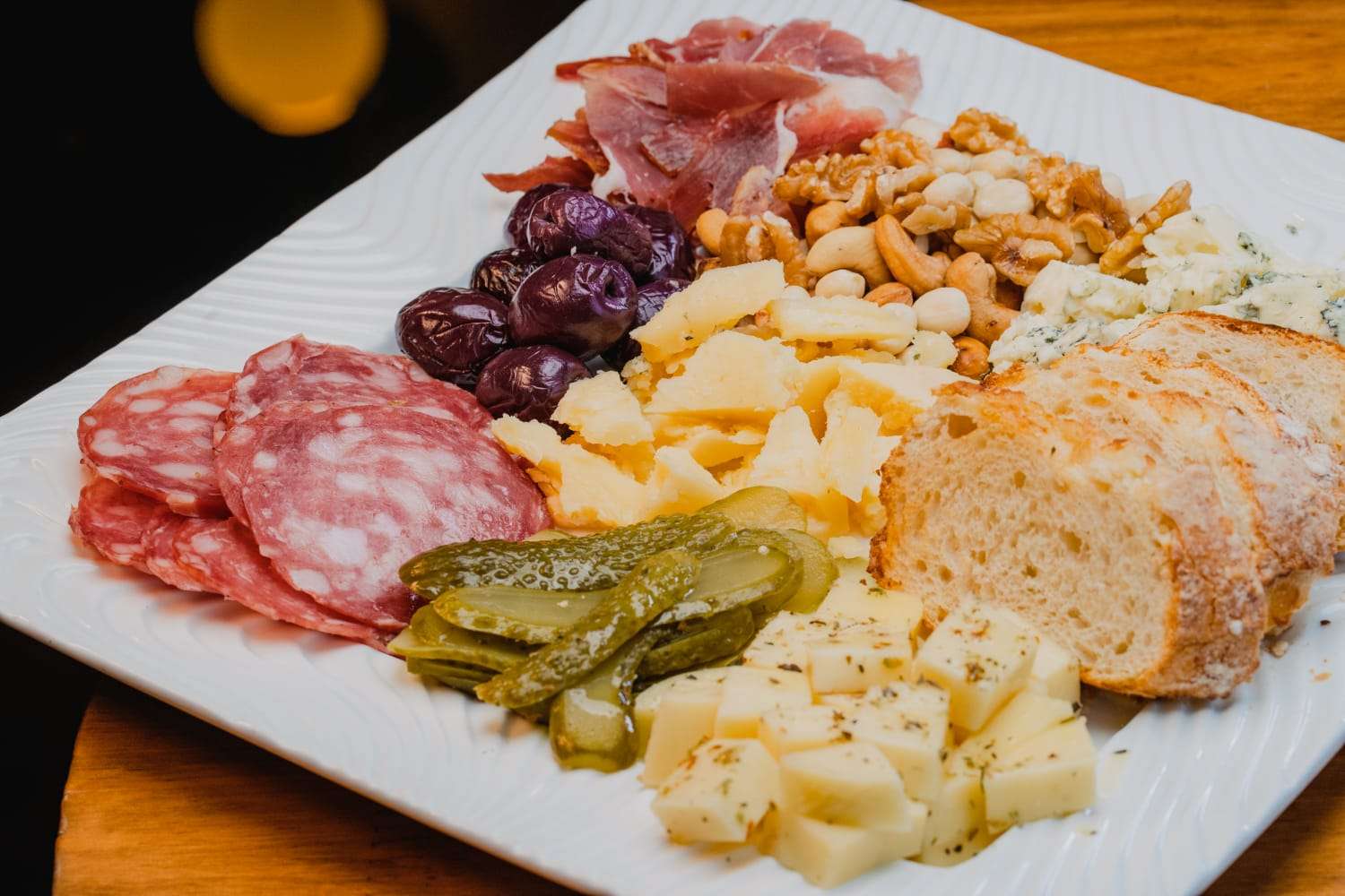 Queijo parmesão, queijo gorgonzola, queijo gouda, queijo brie, presunto Parma, salame, azeitonas pretas, mix de castanhas, tâmaras e picles. Acompanha cesta de pães.