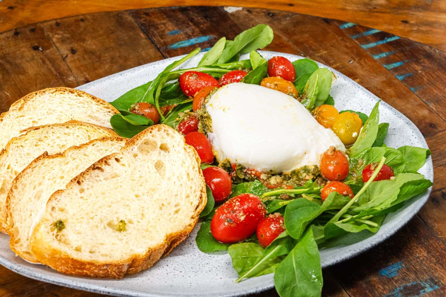 Burrata ao pesto, tomates confit e rúcula. Acompanha torrada de pão italiano.