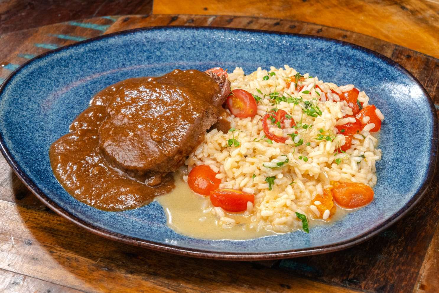 Risoto caprese, acompanha filé mignon ao molho rotti.