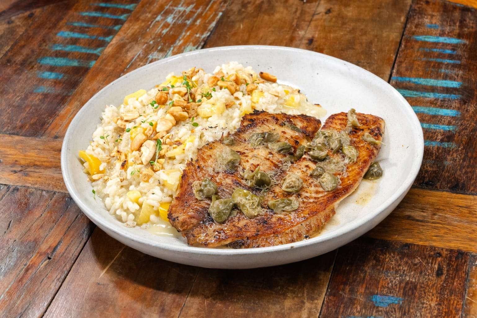 Risoto de damasco com castanhas acompanha filé de tilápia ao molho de alcaparras.