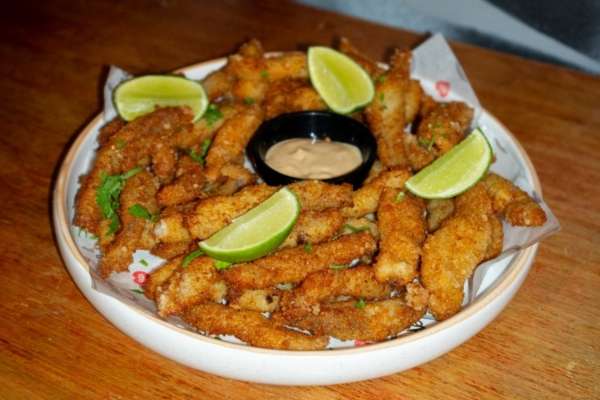 Iscas de tilápia empanadas. Acompanham molho da casa.
