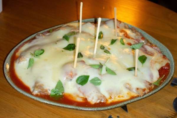 Filé à milanesa, molho de tomate e um blend de queijo muçarela e queijo parmesão. Servido em formato aperitivo.