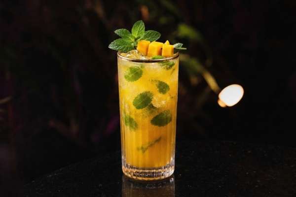 Whisky Escocês, Suco de limão siciliano, xarope de manga e Ginger Ale.